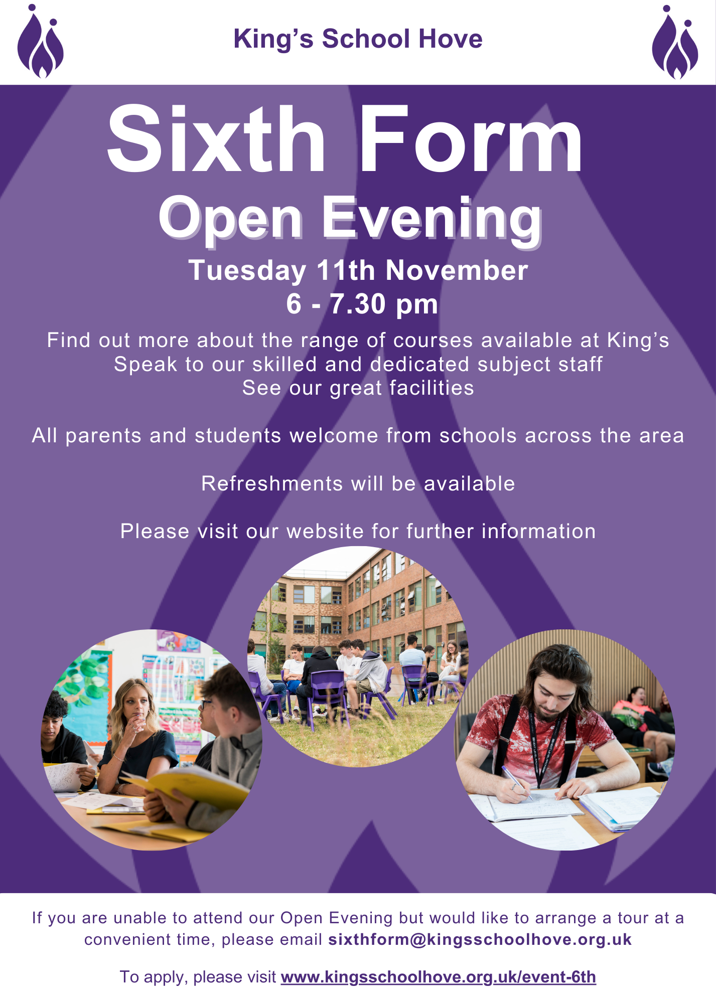 If you would like any further information, please contact us at sixthform@kingsschoolhove.org.uk and we will be happy to answer any questions you have about our fantastic facilities and courses and arrange a convenient time for you to visit us.